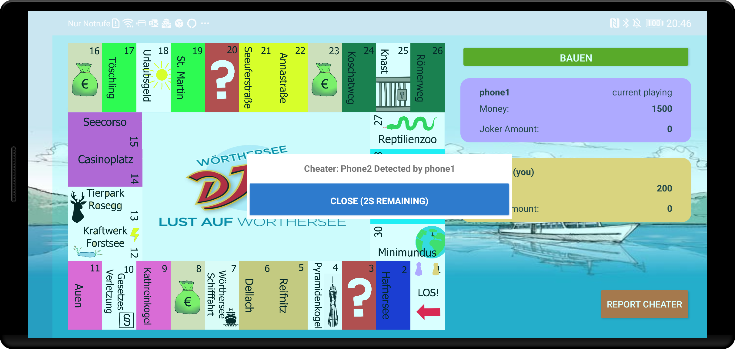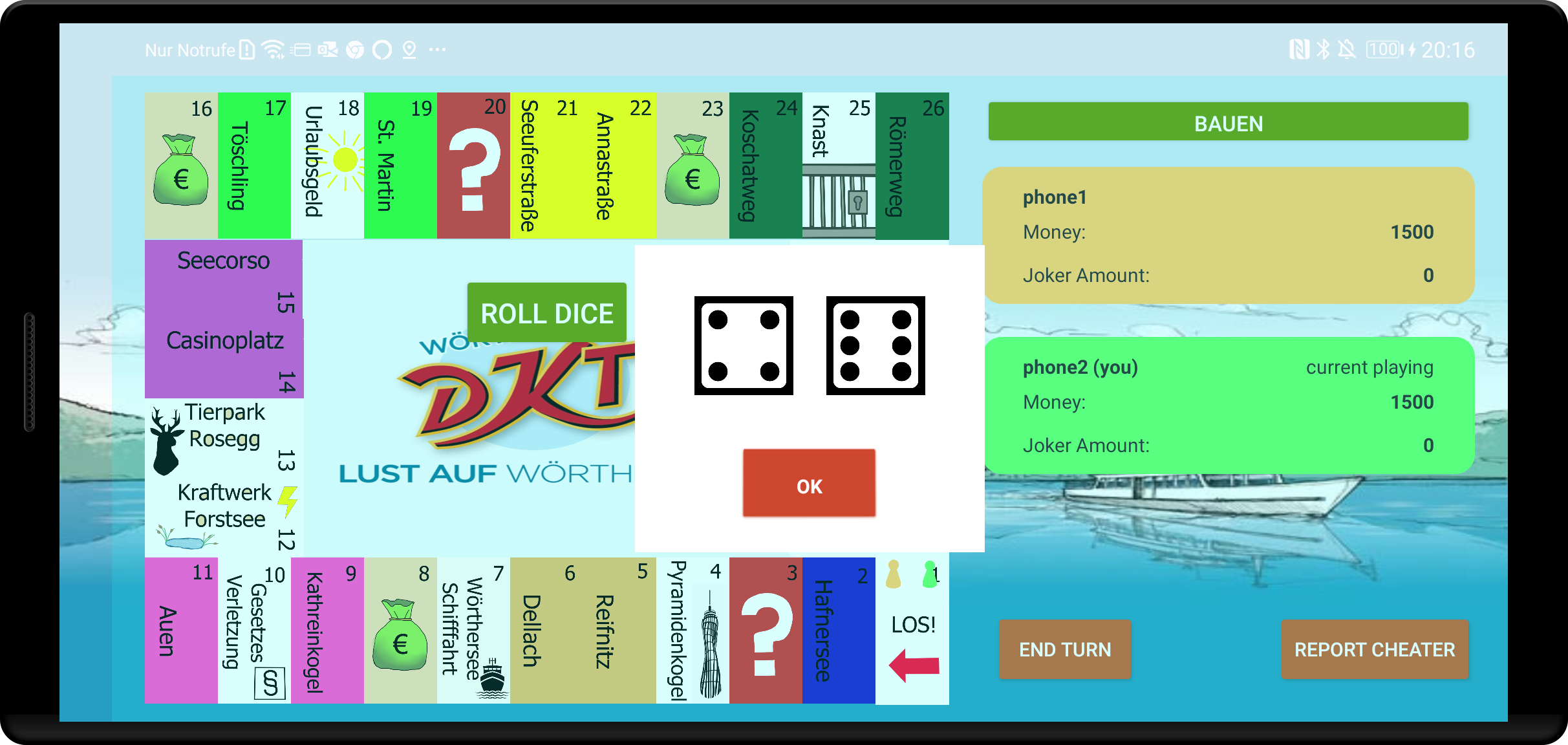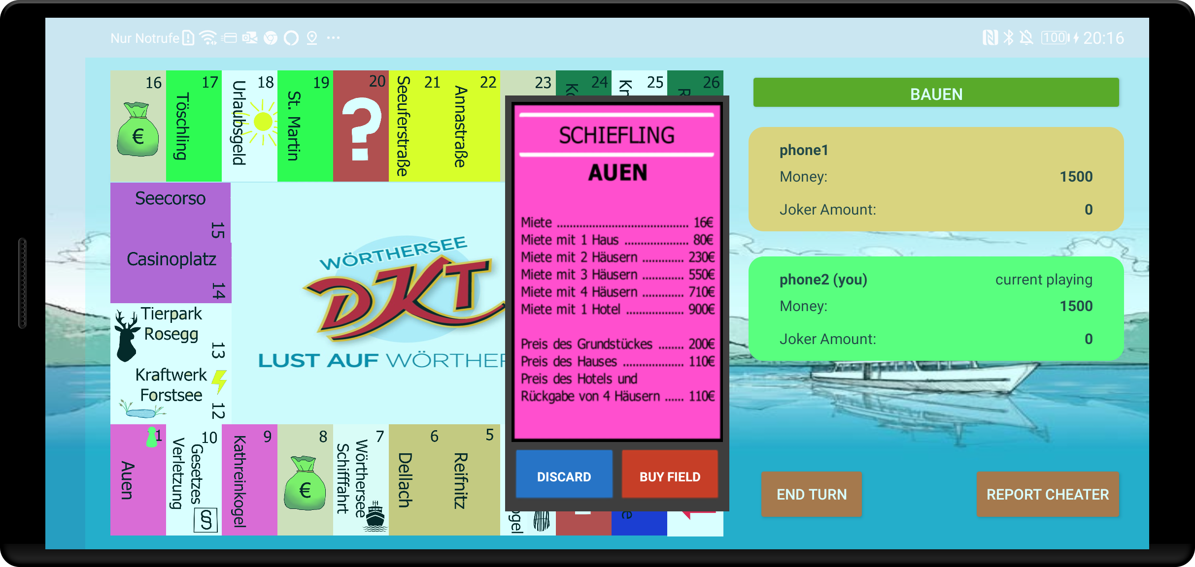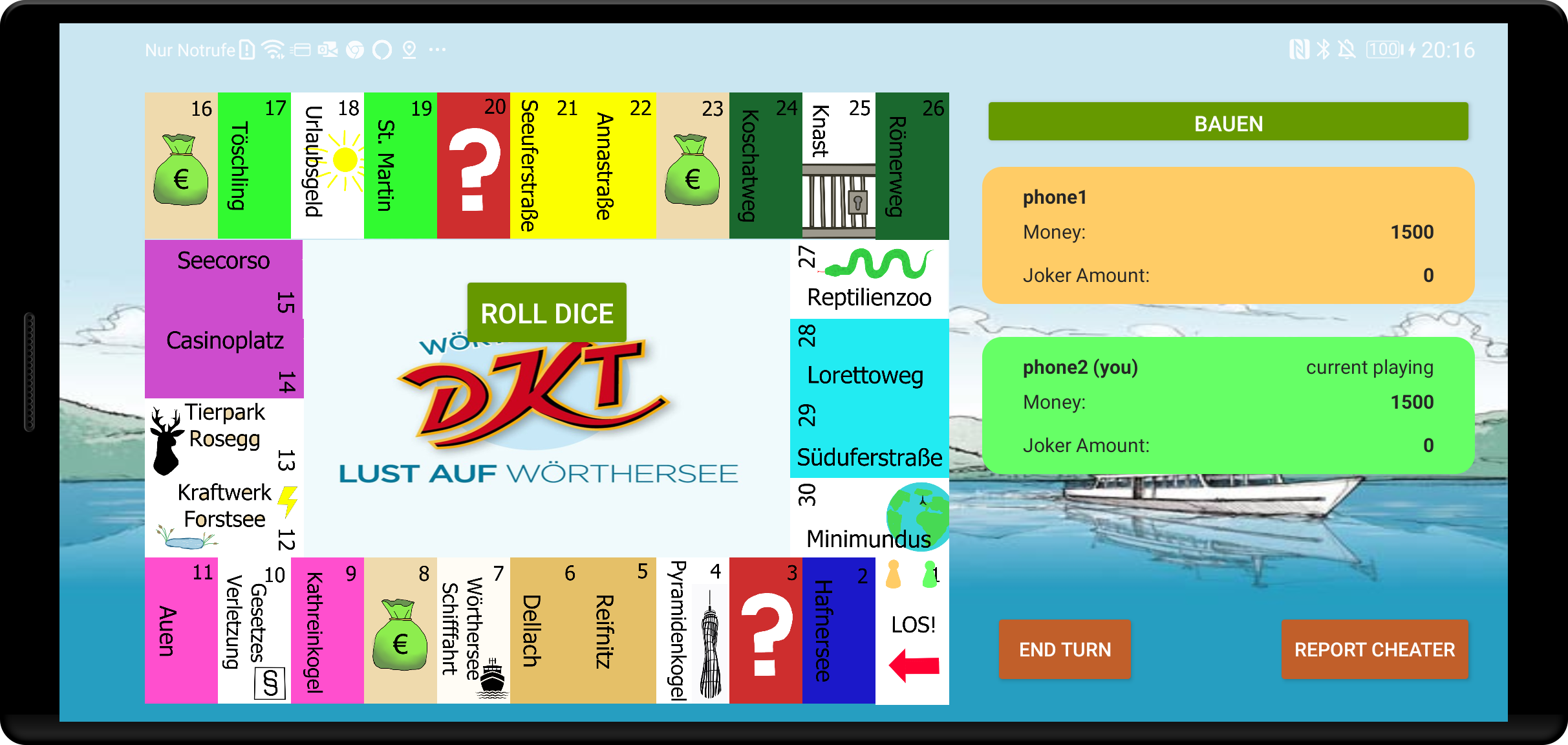 Das Spielbrett des Spiels "DKT – Lust auf Wörthersee" ist eine bunte und lebendige Darstellung des bekannten Wirtschaftsspiels. Es zeigt verschiedene Grundstücke und Orte rund um den Wörthersee, wie den "Seecorso", das "Casino" und das "Minimundus". Spieler bewegen sich mit einem Würfelwurf über das Spielfeld, kaufen Grundstücke, bauen Häuser und sammeln Mieten. Das Interface zeigt deutlich an, wer an der Reihe ist, und ermöglicht das Bauen von Häusern sowie das Verwalten von Geld und Jokern. Besonders ansprechend ist die thematische Gestaltung, die den Wörthersee als zentrales Element integriert, was für ein lokal inspiriertes Spielerlebnis sorgt. Die einfache Benutzeroberfläche macht das Spiel intuitiv und leicht verständlich, während zusätzliche Funktionen wie das Melden von Cheatern und das Verlassen des Spiels für ein faires und flexibles Spielerlebnis sorgen.